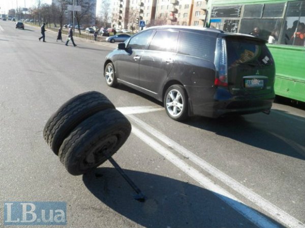 Автобус "Богдан" с пассажирами в салоне двигался по маршруту №180 в направлении улицы Братиславской. По неизвестным причинам у автобуса на ходу отпала левая задняя спарка колес и на полном ходу влетела в стоявший на светофоре автомобиль Mitsubishi Grandis.