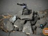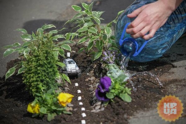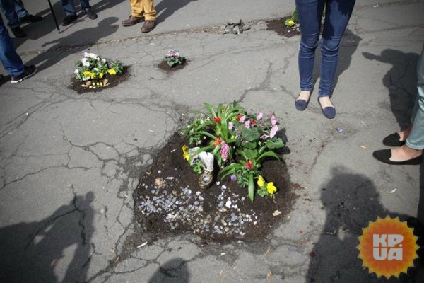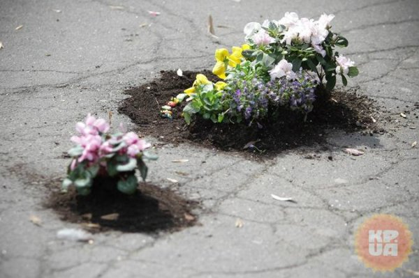 Из акции активисты устроили целую арт-инсталляцию. Засыпали три ямы на тротуаре землей, высадили туда цветы из горшочков, поставили маленький золотой унитаз, воткнули несколько купюр в 20 гривен (ненастоящих) и посыпали все это сверху мелочью.