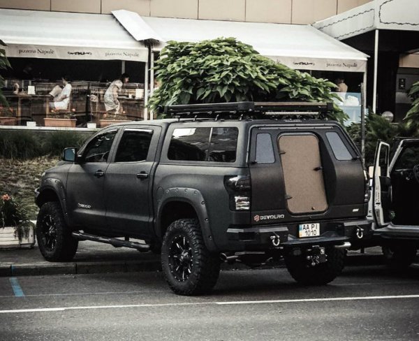 Пикап Тойота Тундра получил внедорожные шины, лебедку и стальные бамперы. Появились кунг с отдельной дверью и дополнительная диодная оптика, а дорожный просвет увеличен. Шноркель позволяет преодолевать броды.