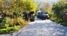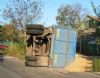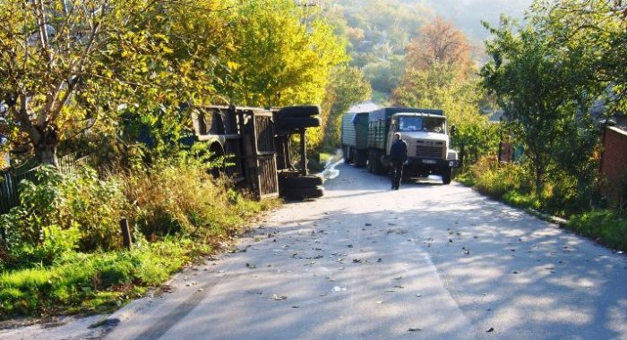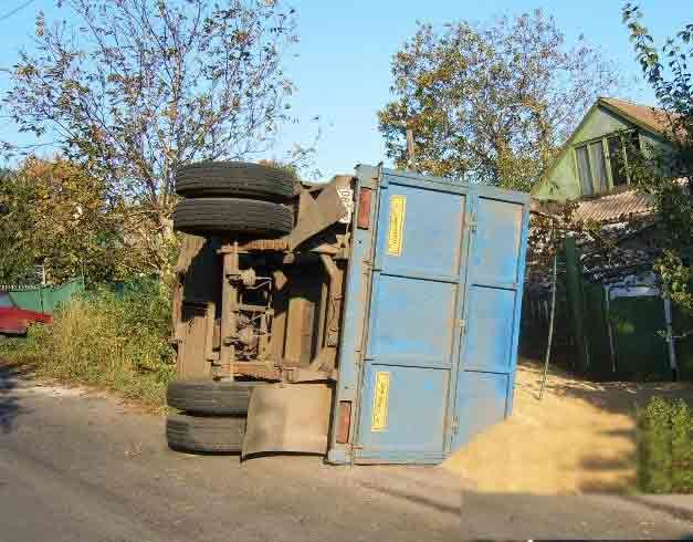 Но слабый двигатель грузовика выдохся на половине крутого подъема по улице Лазарева. Более двадцати тонн пшеницы под действием гравитации потянули сцепку в балку. Водитель не справился с управления и заломил прицеп, оторвав «с корнями» тележку с прицепным устройством. Прицеп, потеряв два колеса, опрокинулся во двор частного домовладения. Щедрый урожай засыпал весь двор испуганного хозяина. Вытянув наверх только тележку, водитель отправился в порт искать помощи.На этот раз отличились уже перевозчики из Запорожской области.