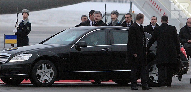 Следом прилетел Петр Порошенко - к трапу его самолета подогнали черный Mercedes S500 с украинскими номерами. В его кортеж также входили автомобили посольства и машины "совминовской" охраны.