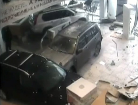 После того как машина сделала несколько кругов по салону и дважды въехала в него с разных сторон, водитель все же остановился прямо у кассы. Его дальнейшая судьба неизвестна. Запись с камер датирована 7 апреля.