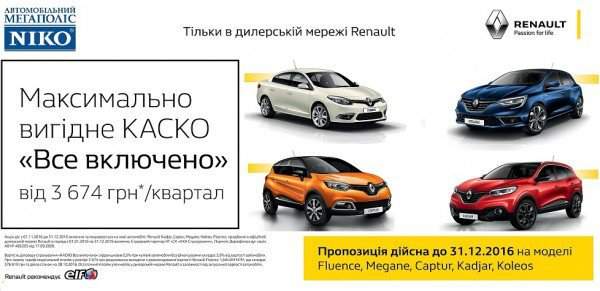 «НИКО Прайм Мегаполис», официальный дилер Renault в Киеве и Киевской области, сообщает об акционном предложении «Максимально выгодное КАСКО». Предложение действует до 31 декабря 2016 года. .