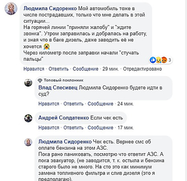 "Мой автомобиль тоже в числе пострадавших. На горячей линии жалобу приняли и сказали ждать звонка… Заправилась, а через километр авто начало стучать", – сообщила Людмила Сидоренко.