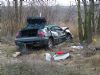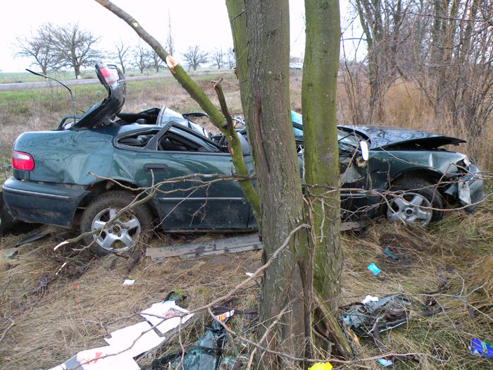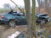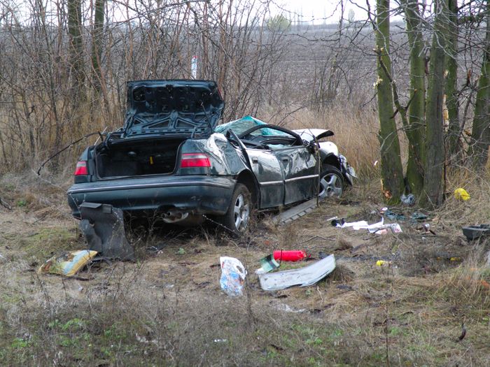 От мощного удара легковушку съехал в левый по ходу движения кювет и совершил наезд на дерево.