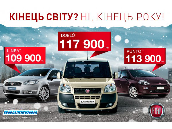 Это и ставший всеобщим любимцем универсальный многофункциональный Fiat Doblo Combi по цене от 117 900 гривен, и комфортабельный семейный седан Fiat Linea стоимостью от 109 900 гривен, и стильный городской хетчбек Fiat Punto 2012 стоимостью от 113 900 гривен.