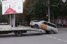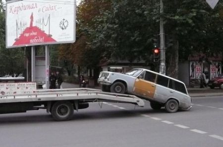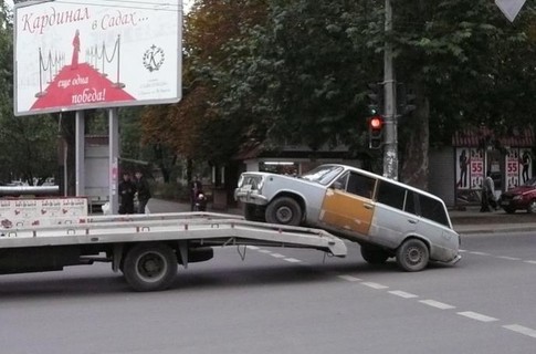 По свидетельствам очевидцев, трос, которым была закреплена машина, слетел и «Жигуль» скатился на проезжую часть, потеряв при этом передний бампер с номерным знаком.