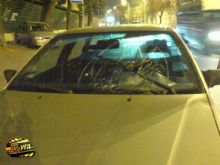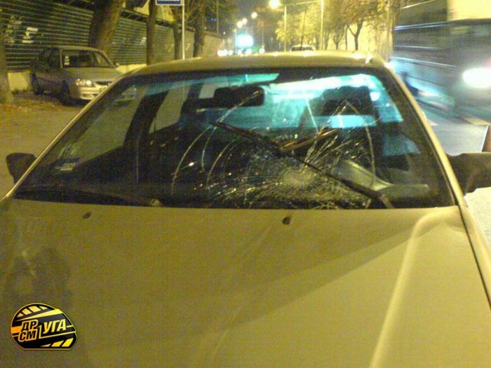 В результате аварии, пешеход упал на капот легковушки и разбил головой лобовое стекло. Он был госпитализирован с закрытой черепно-мозговой травмой и подозрением на перелом руки.