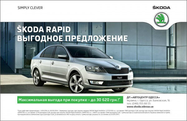 Специальное предложение на автомобили SKODA Rapid завершает действие 30 сентября 2014 года. Спешите приобрести бестселлер SKODA в официальном дилерском центре ДП "АВТОЦЕНТР ОДЕССА" с максимальной выгодой - до 30 620 грн.* только до конца текущего месяца!.