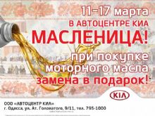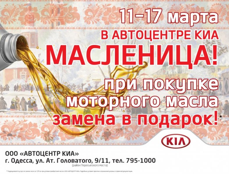 Только до с 11 по 17 марта 2013 года все владельцы автомобилей KIA могут воспользоваться акционным предложением и заменить масло на сервисном центре ООО «Автоцентр КИА» БЕСПЛАТНО!*