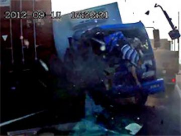 В момент удара через лобовое стекло изящно выпрыгивает водитель в обнимку с пледом и приземляется на ноги прямо перед раскуроченной кабиной своего грузовика.