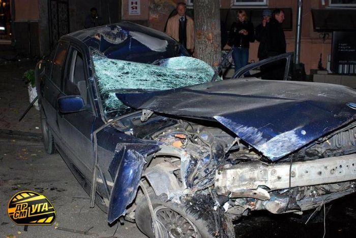 Вчера вечером на ул. Пушкинской BMW сбил рекламный щит и затем врезался в дерево!, сообщает .