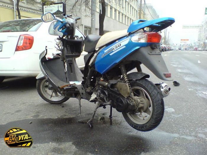 В результате ДТП полностью разбит передок скутера, а его водитель, по словам прибывших на место ДТП медиков, получил ушиб левого предплечья и растяжение связки правого плеча.