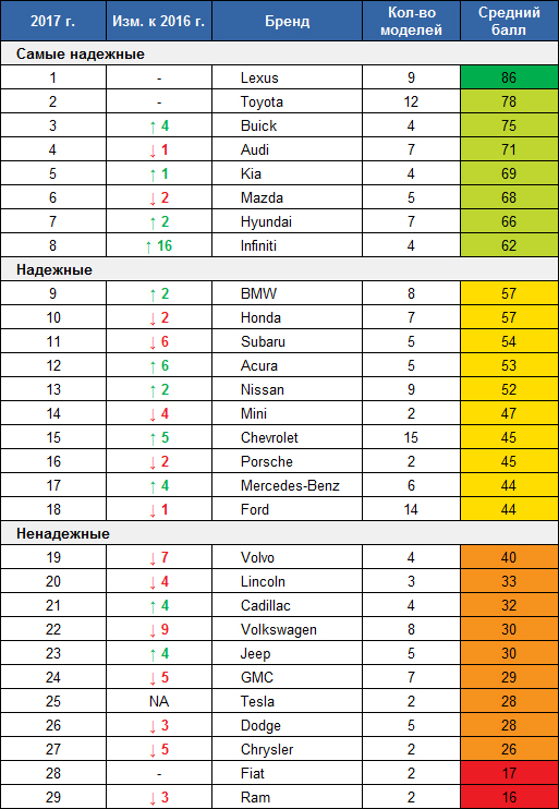 Первые места в рейтинге надежности заняли японские автомобили. Наименьшее количество отказов и поломок зафиксировано у Lexus. На втором месте оказалась Toyota. Замыкает первую тройку Buick. Кроме того, в первую десятку также вошли Audi, Kia, Mazda, Hyundai и Infiniti.