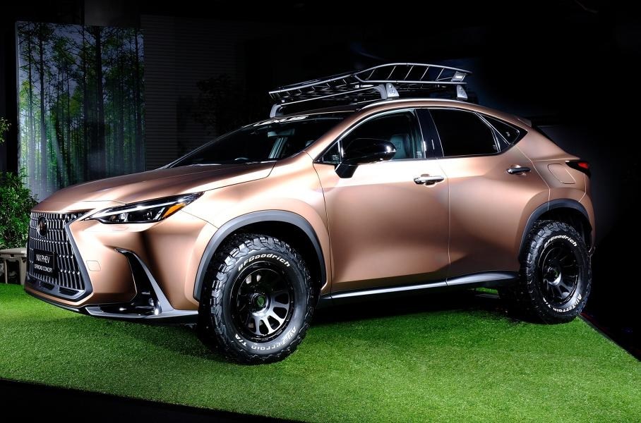 Концепт NX PHEV Off-Road базируется на модификации NX 450h+ — первом заряжаемом гибриде в гамме Lexus. От стандартного «розеточного» кроссовера внедорожный шоу-кар отличает особый бронзовый оттенок кузова, названный Iron Oxide, вседорожные покрышки BFGoodrich All-Terrain T/A, багажник на крыше и матовые черные элементы: 17-дюймовые колесные диски, решетка радиатора и дверные ручки. В черном цвете также выполнены шильдики, окантовка окон и корпуса боковых зеркал.