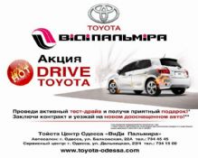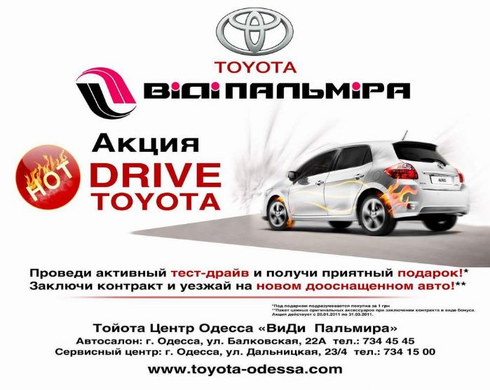 Тойота Центр Одесса «ВиДи Пальмира» сообщает всем поклонникам TOYOTA прекрасную новость – с 20.01.2011 по 31.03.2011 действует акция «НОT DRIVE TOYOTA!», сопровождающаяся приятными сюрпризами и ценными подарками*.