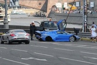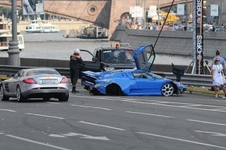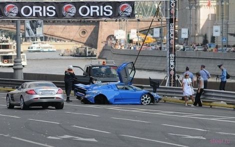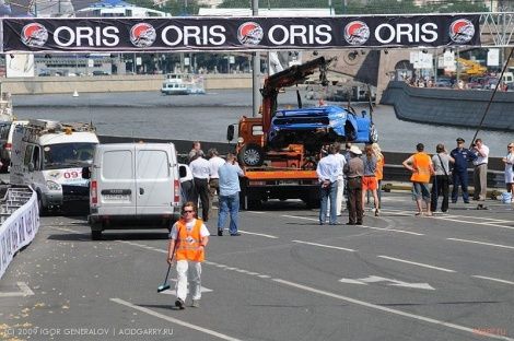 Не обошлось и без аварии - молодой человек на синем Bugatti EB 110 Super Sport не справился с управлением в повороте и врезался в отбойник. Гонку приостановили примерно на час.