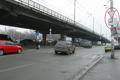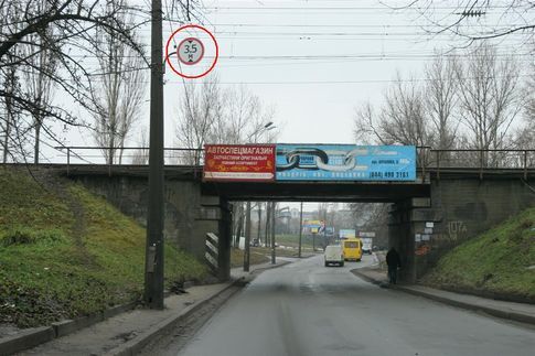 Конец Отрадного проспекта (по пути на Борщаговку). В этом месте есть железнодорожный мост, довольно низкий - 3,5 метра. Знак висит, но его очень плохо видно. И большегрузные машины едут, ни о чем не подозревая. Допустимая высота автопоезда - 4 м. Дальше - цепляют мост. Между тем, если родитель грузовика этот знак и увидел, деваться ему некуда, ведь разворот через двойную сплошную запрещен.