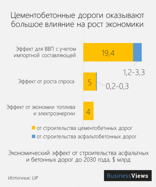 Положительный эффект от бетонных дорог для экономики разнообразен: снижается импорт битума, растет спрос на отечественный цемент, падает потребление топлива, снижаются затраты на освещение дорог из-за лучшей отражательной способности бетона.