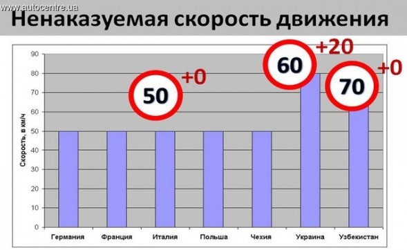 Украина – единственная страна в Европе, где на законодательном уровне установлен ненаказуемый запас в превышении скорости на 20 км/ч, что позволяет водителям, небоясь штрафов, ездить в городе 80 км/ч, а на трассах – от 110 до 150 км/ч. Подобные фривольности как раз и провоцируют львиную долю ДТП в нашей стране. Напомним, что до 2001 года в украинском админкодексе была предусмотрена ответственность за превышение скорости до 20 км/ч, однако в связи со всеобщей на то время демократизацией эта норма была исключена.
