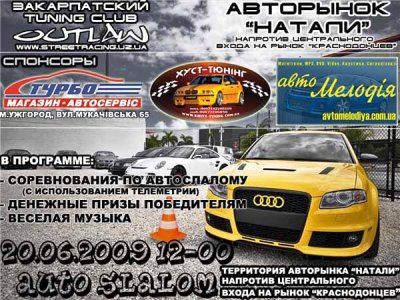 Участие в первых официальных соревнованиях по автомобильному слалому в Закарпатской области, которые прошли на территории авто рынка «Натали» и были организованные общественной организацией «Ужгородский тюнинг клуб OUTLAW», приняло 13 автомобилей, сообщает .