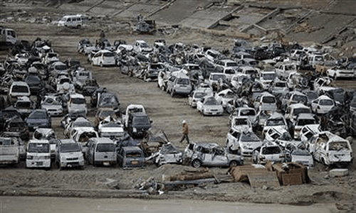 После того как с площадок убрали строительные конструкции и мусор, на них начали свозить тысячи машин, унесенных волнами и искореженных подземными толчками.