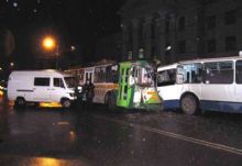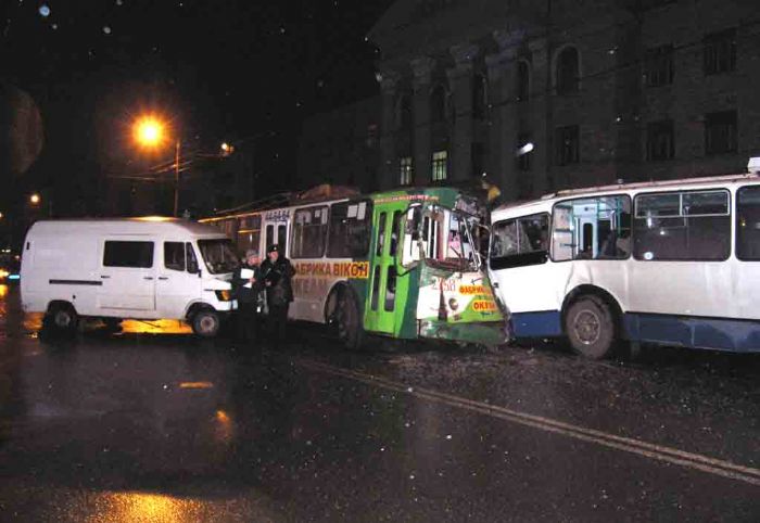 В следствие мощного удара Mercedes выехал на полосу встречного движения и развернулся на 180 градусов. Этим временем троллейбус столкнулся еще с одним троллейбусом, который стоял на остановке.