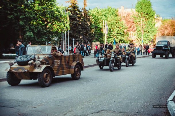 В пробеге принимают участие два мотоцикла М72, грузовик ГАЗ-63, внедорожник Volkswagen Kubelwagen, которые принадлежат одному из военно-исторических клубов, сообщил блогер Артем Гетьман.