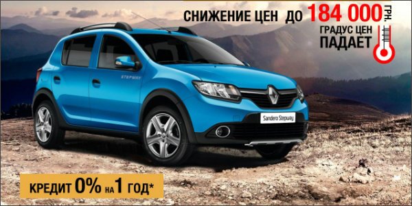 *Имеется в виду снижение цены на автомобили Renault по сравнению с ценами по состоянию на канун. Конкретный размер снижения зависит от комплектации. Максимальное снижение составляет: Renault Koleos - 184 140 грн. По состоянию на 6.03.15 Цены и снижение цены включая НДС.