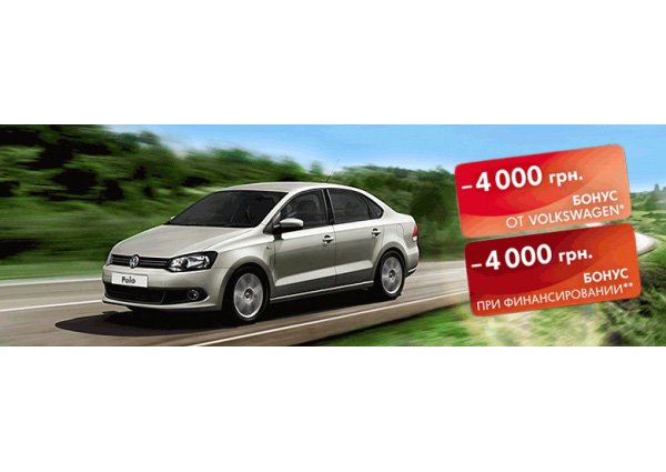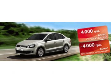 Покупая автомобиль Polo sedan, Вы получаете бонус размером 4000 грн.*, а так же, при покупке автомобиля с финансированием от Porsche Finance Group , Вы получаете дополнительный бонус размером 4000 грн.!**