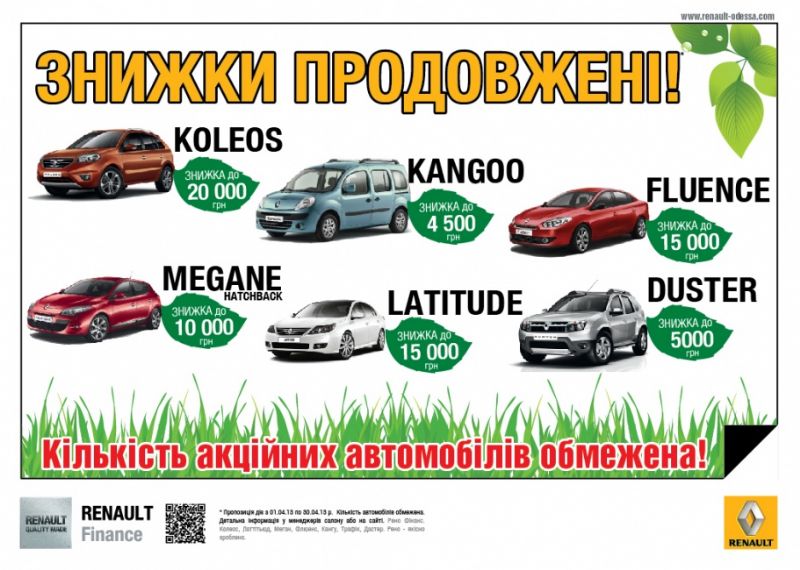 Автоцентр RENAULT ООО «АВТО ГРУП+» объявляет о продлении весенних скидок на автомобили RENAULT 2012 модельного года! Выбирайте свой RENAULT со специальной - весенней скидкой:.