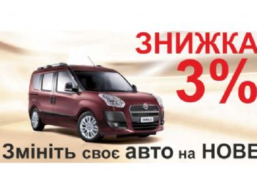 Получите свою 3% скидку на покупку автомобиля Fiat Nuovo Doblo Panorama. Скидка 3% предоставляется покупателям, ранее приобретавшим (имеющим в собственности, в распоряжении) автомобили FIAT Doblo / Nuovo Doblo всех модификаций, как официально, так и неофициально поставленных в Украину.