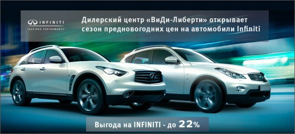 *Специальное предложение действует в дилерском центре «ВиДи-Либерти» и распространяется на все указанные модели Infiniti 2014 года выпуска. Специальное предложение действует с 25.11 по 31.12 2014г. Под выгодой понимается процент скидки от предыдущей стоимости автомобиля.