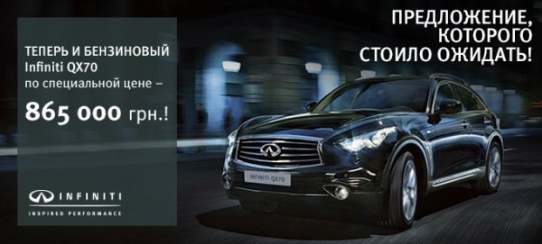 Стоимость бензинового QX70 3.7 в комплектации Premium + NAVI составляет 865 000 грн*. с НДС.