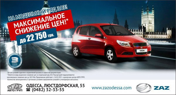* Имеется в виду акционное снижение цен на модельный ряд ЗАЗ. Под выгодой подразумевается максимальное снижение цен на ЗАЗ Vida. Предложение действует с 16.02.2015 в дилерском центре АВТО ГРУП. Количество авто ограничено. О детальных условиях предложения узнавайте у менеджеров автосалона.