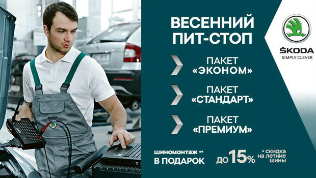 В период с 15 марта по 30 апреля 2018 года для Вашего удобства весенний пит-стоп в трех версиях для самых экономных и требовательных автовладельцев SKODA