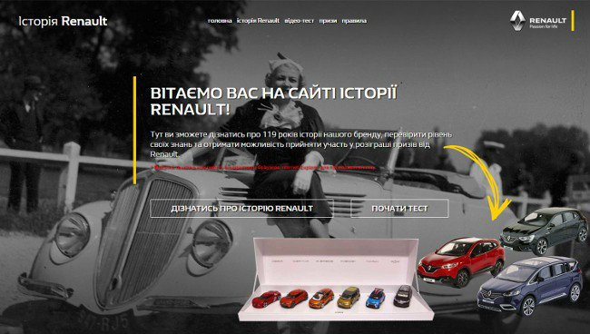 Бренд Renault, пишаючись своєю історією, хоче поділитися нею зі своїми клієнтами та прихильниками. З 23.08.2017 р. до 23.11.2017 р. на сайті Історія Renault можна дізнатись про 119 насичених років історії бренда Renault, пройти відео-тест та отримати можливість прийняти участь у розіграші фірмових призів.