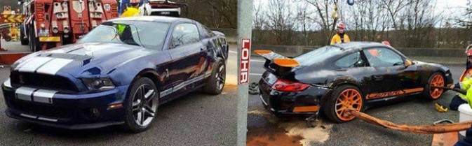 ДТП случилось на скоростной трассе А12, где водитель фуры по какой-то причине не справился с управлением и «положил» машину на бок. Вместе с фурой на бок легли несколько дорогих автомобилей, находящихся на прицепе. В аварии пострадали Ferrari F430, Ford Mustang Shelby GT500, Porsche Cayman, трековый Porsche 911 и несколько моделей Lamborghini.