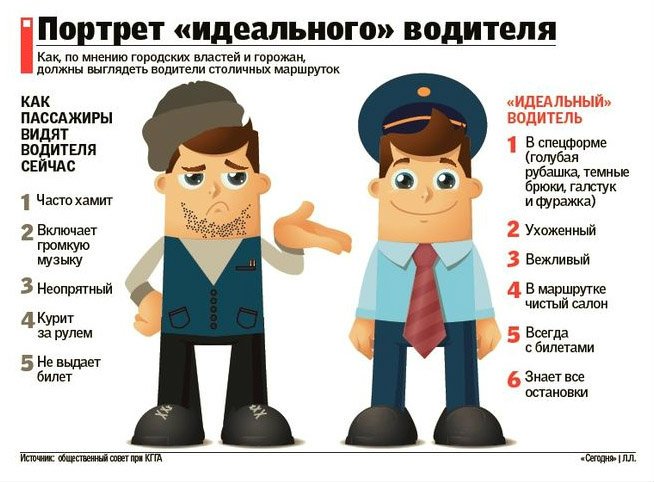 Решила власть поднять и вопрос форменной одежды для «рулевых» столичных маршруток. Михаил Костюк отметил, что обеспечение водителей спецформой ляжет на плечи компаний-перевозчиков. Форма будет двух видов: повседневная и официально-праздничная. «Повседневная форма — это синяя куртка, голубая рубашка, темная обувь. Летом — рубашка с коротким рукавом, более легкие темно-синие или черные брюки. Также у шоферов будет синяя фуражка: она стоит под первым номером в приказе по форме. Праздничная форма — это белая рубашка, темный галстук», — делятся планами в совете. А вот спортивную одежду и шлепанцы собираются категорически запретить. Привлекли идеологи и Ассоциацию соцрекламы: специалисты-художники создадут образы «идеального» и «плохого» водителей. Такие «фотороботы» расклеят во всех маршрутках, чтобы сами шоферы не забывали, как им нужно выглядеть.