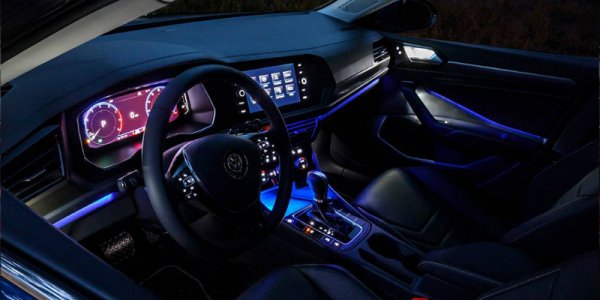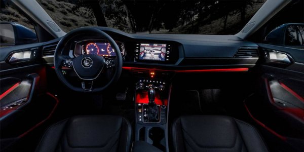 В салоне Jetta установили новую приборную панель и модернизированную мультимедийную систему с поддержкой Apple CarPlay, Android Auto и MirrorLink. Также водителю доступна светодиодная подсветка, которая позволяет выбрать до 10 оттенков. Автомобиль укомплектовали системой аварийного торможения, функцией удержания в полосе движения, а также системой контроля за «слепыми» зонами. Опционально доступны адаптивный круиз-контроль, аудиосистема Beats и большая панорамная крыша.