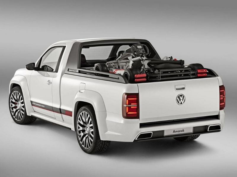 На ежегодном фестивале тюнинга в австрийском Вертерзее концерн Volkswagen продемонстрировал необычный концепт. Компания Volkswagen показала удлиненную версию пикапа Amarok, которая получила название XXL. Пикап VW Amarok не только научили быстро ездить по асфальту, но и приспособили его в качестве автомобиля технической поддержки для гонщиков.