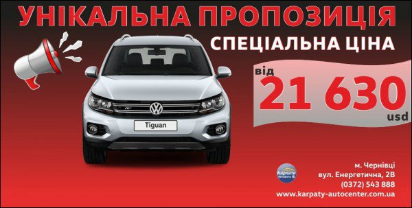 Автосалон «КарпатиАвтоцентр» пропонує скористатися унікальною пропозицією придбати Volkswagen Tiguan по спеціальній ціні!.