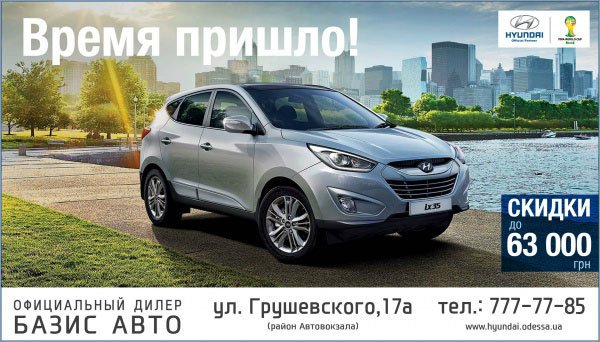* Предложение действительно до окончания товарных запасов на складе размер скидки указан при покупке автомобиля HYUNDAI ix35 (F/L 4WD Top AT ,2013 год выпуска, кузов TMAJU81EDEJ487869) в сравнении цен на акционный автомобиль и автомобиль той же комплектации 2014 года выпуска по состоянию на 04.06.14 (397 600грн. – 2013г.в, 461 400грн. – 2014 г.в)