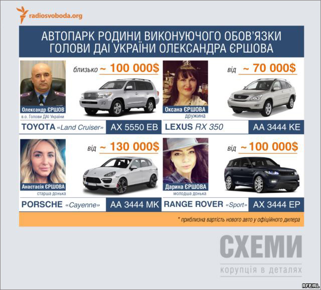 Члены семьи главного «гаишника» страны Александра Ершова ездят на дорогих элитных автомобилях стоимостью около $100 тысяч каждая, и постоянно отдыхают в заграничных пятизвездочных отелях. При этом Ершов является госслужащим и официально зарабатывает около 12 тыс. грн. в месяц, сообщает .