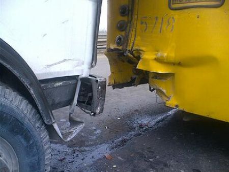 После такой неравной битвы автобус остался со значительными повреждениями, но МАЗу тоже досталось. У автобуса полностью повреждена задняя часть, погнуто крыло и разбит пластик. У МАЗа погнут бампер, разбита фара и прогнут радиатор.