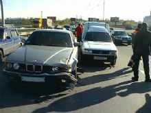 За Lada ехало BMW-730, его водитель, увидев ситуацию, сложившуюся на проезжей части, повернул влево, чтобы избежать удара, но опять неудача… BMW таки успело зацепить крыло бедной Lada, повредив и свою переднюю часть.