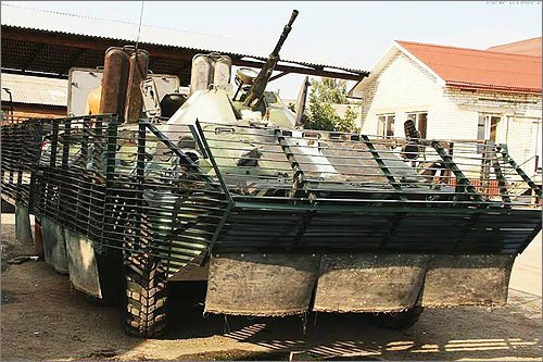 Это приспособление должно увеличить выживаемость машины при попадании снаряда, направленного на уничтожение бронетехники. Вот так теперь выглядит БТР после апгрейта.