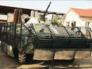 Именно после “ранения” руководством “Омеги” было принято решение о необходимости обшить БТР-80 антикумулятивной решеткой (ее еще называют экраном). Это нехитрое приспособление должно увеличить выживаемость машины при попадании снаряда, направленного на уничтожение бронетехники.