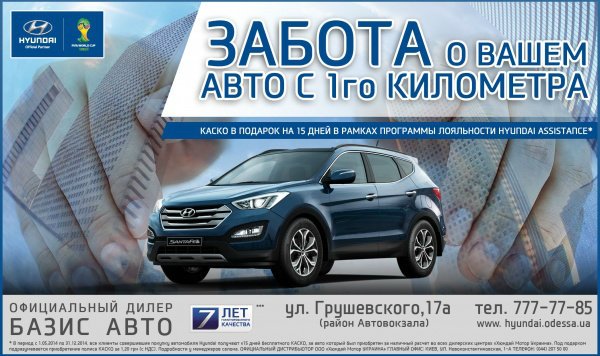 * Программа действует с 1.05 по 31.12.2014 года. Все клиенты совершившие покупку автомобиля Hyundai получают «15 дней бесплатного КАСКО, за авто который был приобретен за наличный расчет. Под подарком подразумевается приобретение полиса КАСКО за 1,20 грн (с НДС). Подробности у менеджеров салона.