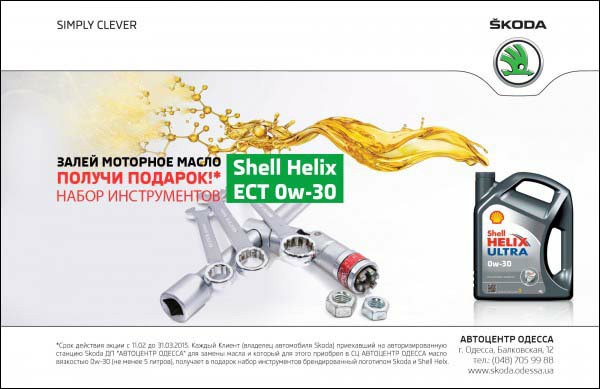*Срок действия акции с 11.02 до 31.03.2015. Каждый Клиент (владелец автомобиля Skoda) приехавший на авторизированную станцию Skoda ДП "АВТОЦЕНТР ОДЕССА" для замены масла и который для этого приобрел в СЦ АВТОЦЕНТР ОДЕССА масло вязкостью 0w-30 (не менее 5 литров), получает в подарок набор инструментов брендированный логотипом Skoda и Shell Helx.
